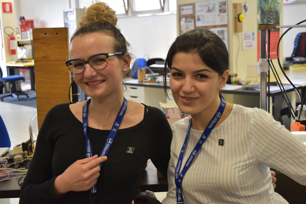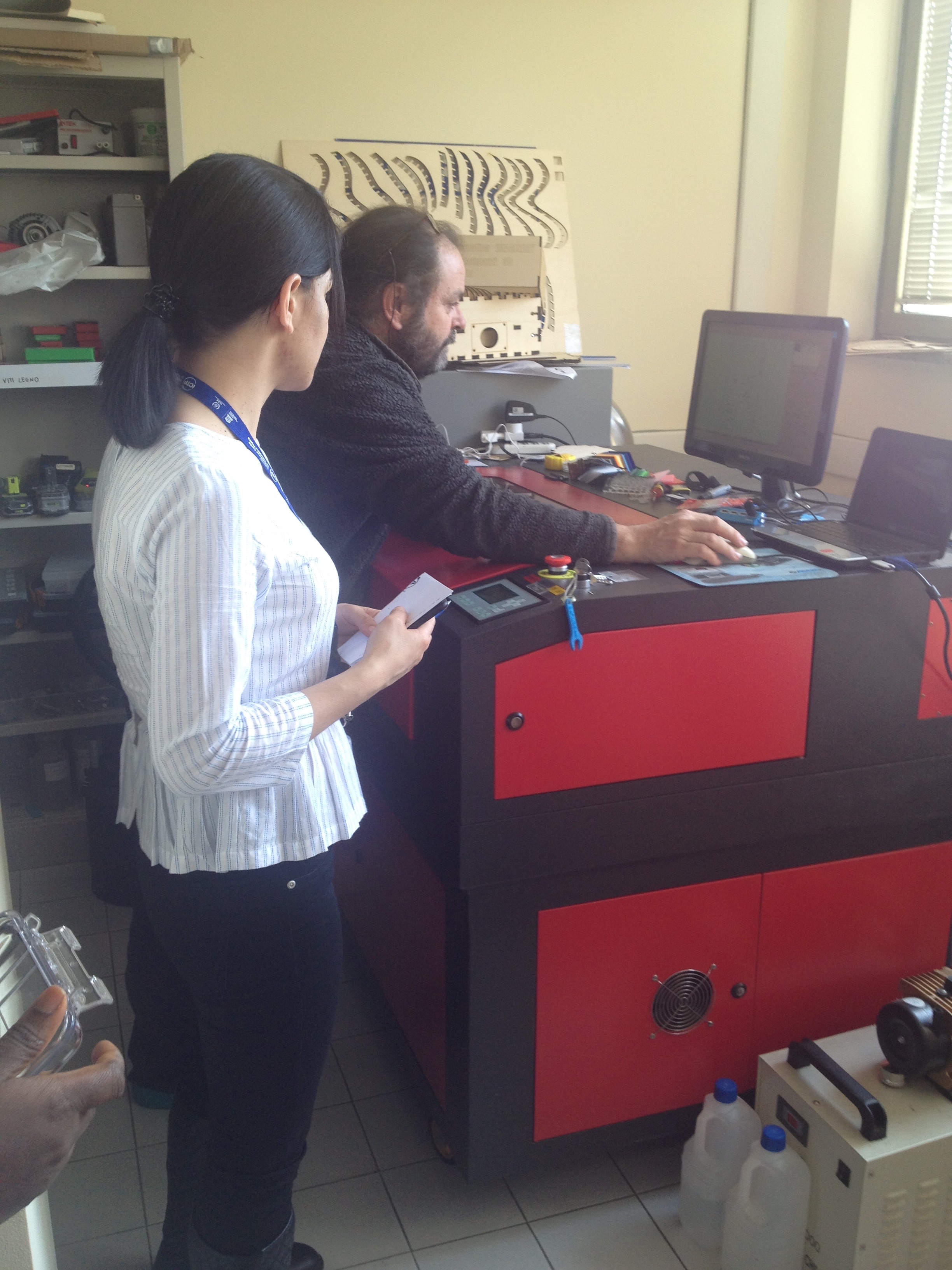 SciFabLab director Carlo Fonda helps Marine Voskanyan (Armenia) laser-cut her custom Nano plates.