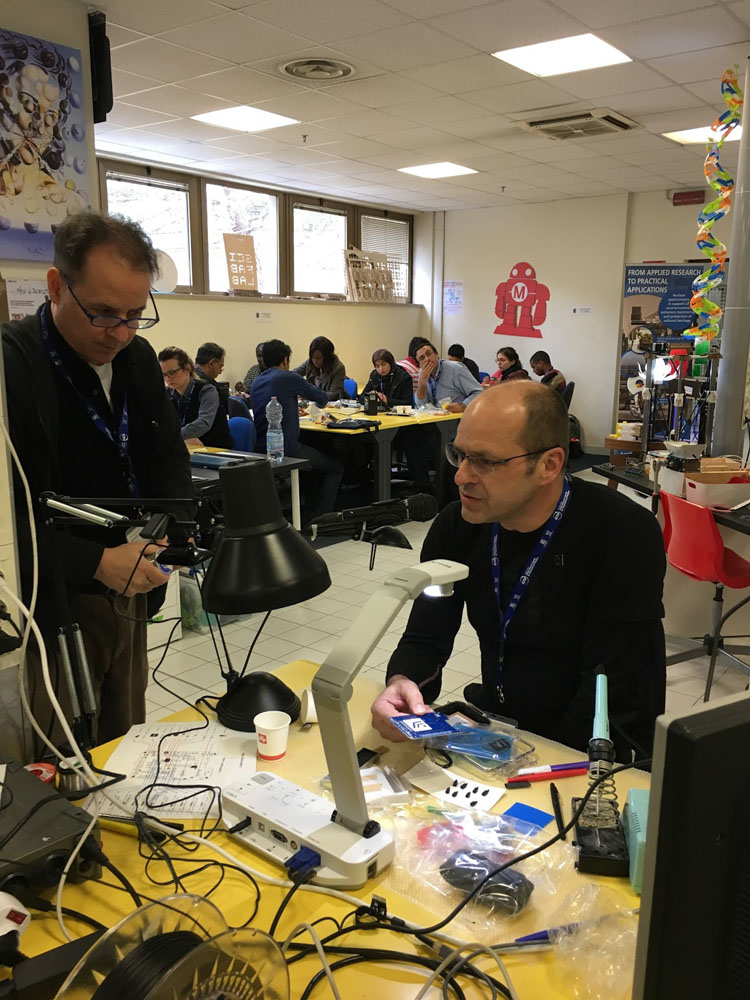 The ICTP SciFabLab is large and extremely well-equipped and staffed (we counted thirteen 3d printers in various stages of operability…). Thirty people were able to build their Nanos simultaneously without trouble.