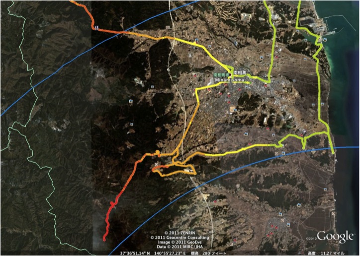 2011年5月5日(木)〜7日(土)の日程で、福島県北部(福島市・川俣町・飯舘村・南相馬市)における調査の一貫として、プローブカーによる放射線量調査を実施しました。調査方法及び結果は、すでに本サイトのブログで公開しているとおりです。グーグルアースのkmzファイルは[ここ]からダウンロード可能です。
