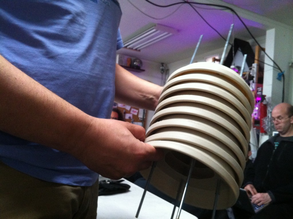 Last night at the weekly Crash Space meeting, Naim showed off the current, working, Safecast Air prototype during show & tell, as well as an example of a possible housing using plates. We’re calling the device the “canAIRe” and may actually use a can as the housing, but this was interesting to see in practice. The housing is important because it has to let enough air through to be measured, while still protecting from the elements. We’ve also realized that the particle sensors we’re going to need are are going to be much beefier than originally anticipated – the cheaper smaller ones only perform in heavily contaminated areas, so for any reliable measurements at low levels we need to step up the hardware. More soon!