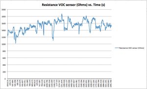The device we were using monitors temperature, humidity, the concentration of Carbon Monoxide, as well as the concentration of Volatile Organic Compounds (VOCs – essentially unburned hydrocarbons like methane and gasoline ). The sensors we’re using are designed to change their electrical resistance in response to a change in the concentration of a particular gas. For example, the resistance of the VOC sensor will drop as the concentration of VOCs rises in the air. Calibrating these sensors involves converting these readings, often in combination with temperature and humidity measurements, into a physical value for gas concentration. What we have so far in running our monitor are these resistance changes. Below is a graph taken from the VOC sensor on the air monitor from about twenty minutes of standing by the Shibuya crossing: