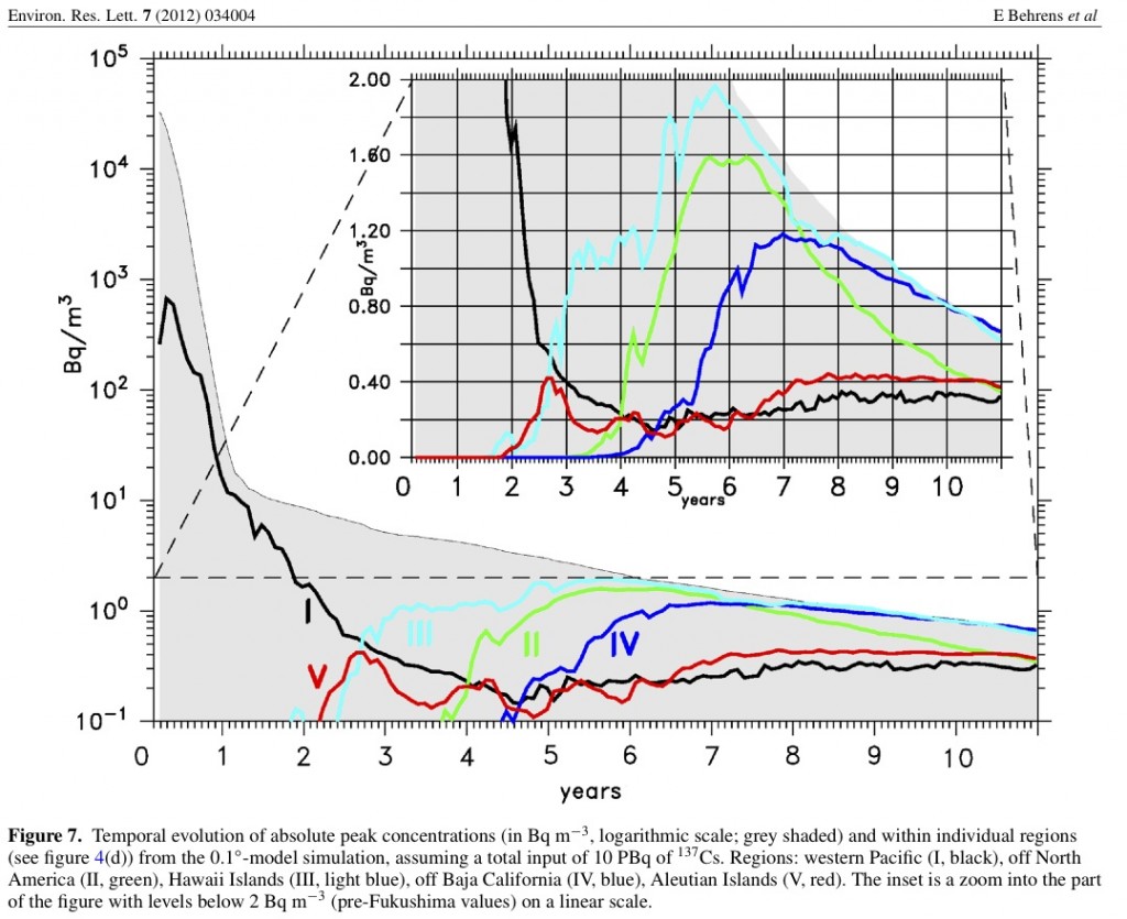 In the graph above, the black line indicates Cs levels close to Japan, which rose to about 10000 Bq/m3 shortly after the start of the disaster due to the tremendous quantities of radiation directly discharged into the ocean and entering it as fallout from aerial discharges during the first several weeks. The light blue line shows expected levels near Hawaii, red is near the Aleutians, dark blue is Baja California, and green is North America. In the case of Hawaii and the North American coast, ocean C-137 levels are expected to peak at about 0.004 Bq/L, compared to about 0.001-0.002 Bq/L before the accident. Other areas are expected by this team to be less. (Both this study and the one by Nakano, et al, cited above come up with similar predictions, while the one by Rossi, et al, predicts levels about 10 times higher) (From: Behrens, et al : Model simulations on the long-term dispersal of 137Cs released into the Pacific Ocean off Fukushima)