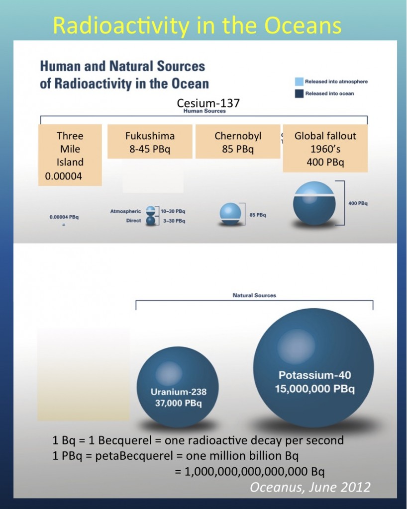 Dr. Ken Buesseler of The Woods Hole Oceanographic Institute (WHOI) has authored or co-authored several of the most informative studies of Fukushima ocean impacts. The illustration above is from one of his presentations, and shows how Fukushima radioactive releases to the world’s oceans compare to those from Chernobyl and weapons testing, as well as to natural radiation. As you can see, while Fukushima released quite a lot of Cs137 to the oceans, the amount appears to be somewhat less than that from Chernobyl, about 1/10 of that from global testing, and only a tiny fraction of the natural radiation (mainly Uranium 238 and Potassium 40) that has always been there. WHOI is reportedly in the process of testing water samples taken from the ocean offshore off northern California, and hopefully the results will not be long in forthcoming.