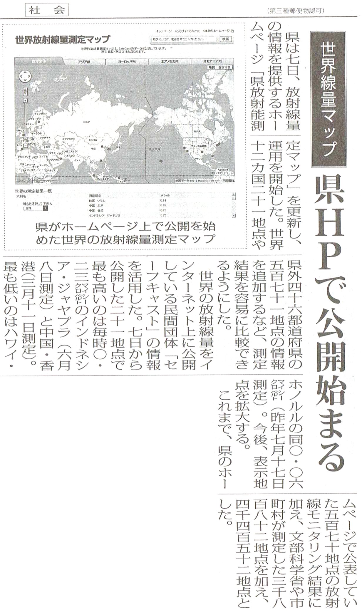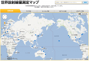 Fukushima Prefecture. updated its website “Fukushima prefecture radiation map” on Sep. 7th and started displaying radiation levels from around the world. Twelve countries with 21 spots and 46 prefectures outside of Fukushima with 571 spots are shown with data provided by Safecast, a citizen group, so that people can compare radiation levels to the rest of the world.