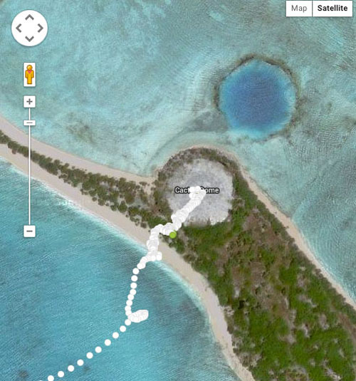 Buesseler’s team surveyed the Runit Dome (aka “Cactus Dome”) at Enewetak, which covers the 30-foot (9 meter) deep, 350-foot (107 meter) wide crater created by the May 5, 1958, Cactus test.