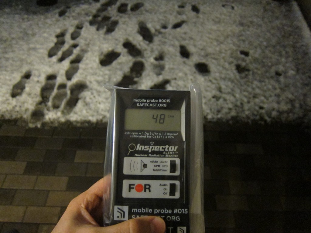 Well, I did measure quite different levels compared to what the “normal” post-Fukushima levels are in my neighborhood (background typically around 30-40 CPM or 0.05-0.07 uSv/hr on the PRD). I used a cloth to capture fresh snow fall as opposed to measuring snow that already had accumulated.