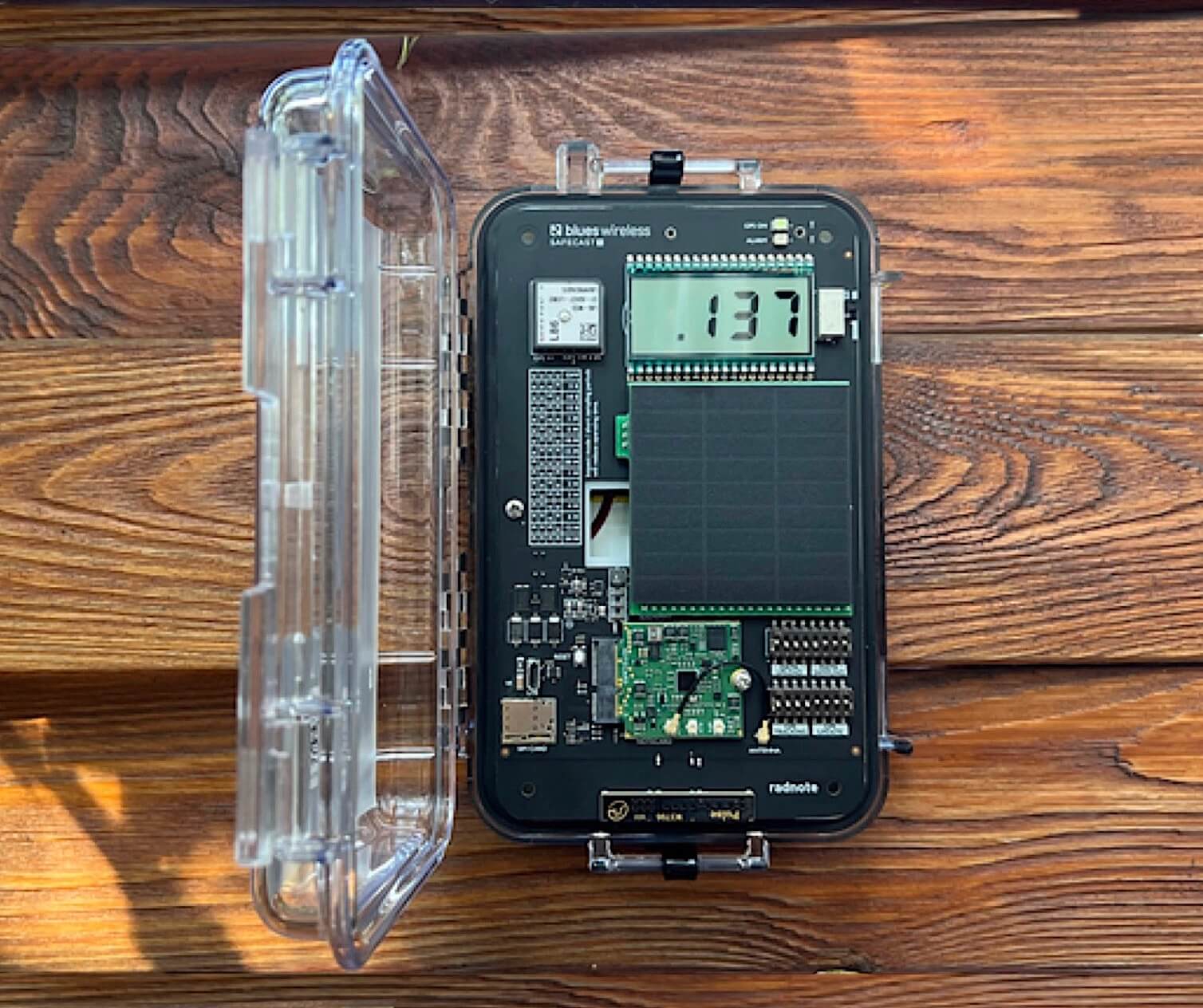 The RADNOTE realtime radiation monitor was developed for precisely this kind of scenario. It is produced for Safecast by Blues Inc, whose support made this project possible. Because it is solar-powered, RADNOTE is not vulnerable to the power outages that have knocked many official Ukrainian sensors offline during blackouts caused by Russian attacks on energy infrastructure. RADNOTE uses cellular wireless data transmission via the Blues Notecard, a revolutionary low-power cellular card designed specifically for IoT data applications. This eliminates any dependency on the vulnerable wired internet connections typically used for networked sensors. RADNOTE is rugged, weatherproof, and can be installed by volunteers in a few minutes.