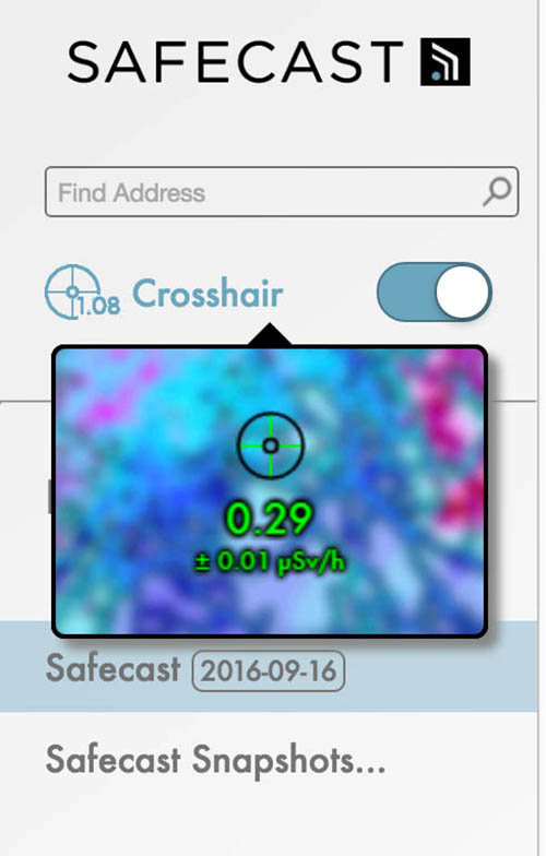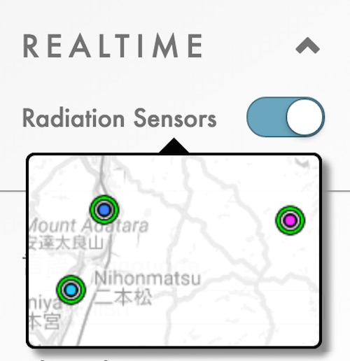 By default, Safecast’s Pointcast realtime sensors are displayed on the tilemap, and clicking on them displays recent data readings and provides access to more information (see the blog post Pointcast Rollout, Part 1 for a complete explanation). The “Radiation Sensors” control toggles the display of these sensors on and off.
