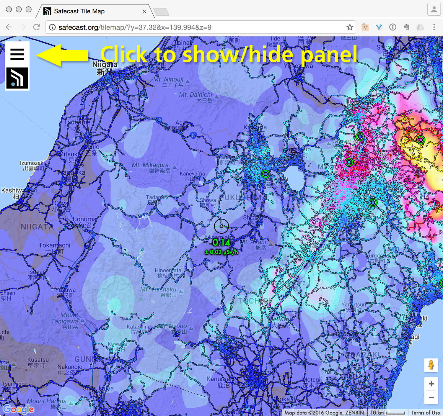 When the Tilemap is opened in a browser, by default it will be centered on Fukushima, with both the most current datapoints and interpolation enabled, and Pointcast sensors displayed. The basemap is Google’s standard map. The update adds a control in the upper left corner to show and hide the new control panel.