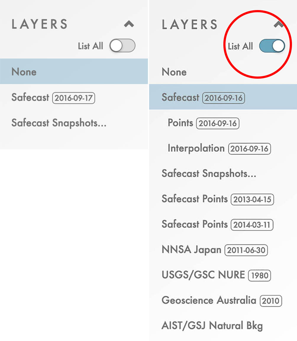 This initially appears in a partially expanded state, allowing the user to select either the most recent Safecast data (the date of the update is indicated in a box to the right of the name), or to open the Safecast Snapshots panel, which allows displaying a time-based selection of data (see below). The “List All” toggle displays the entire list of available data layers. The caret mark collapses the layer panel itself.
