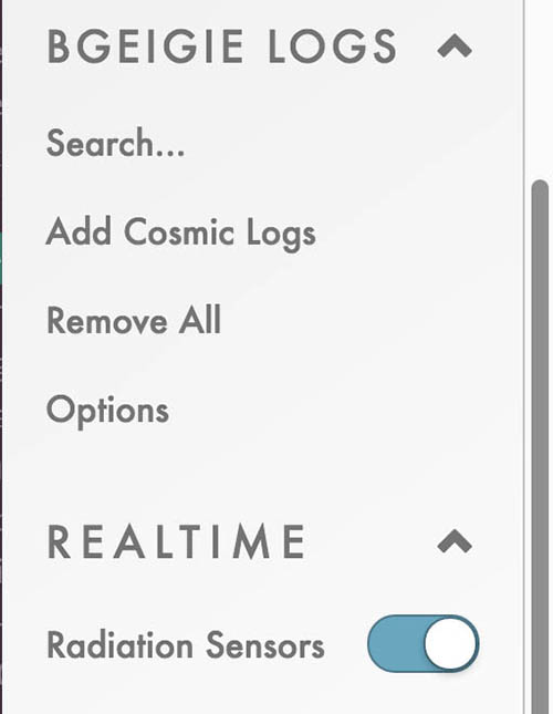 When fully expanded, the Layers panel gives complete access to groups of Safecast data individually, as well as to other open-source radiation datasets and Pointcast realtime sensors. It also gives access to the feature for displaying selected Safecast log files.