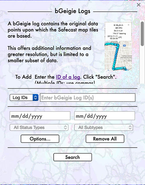 Quite a few Safecast volunteers log radiation data on airline flights, but this is not normally displayed on the Safecast map. There is now a “subtype” selector when data is uploaded which includes “cosmic” radiation, and the “Add Cosmic Logs” menu item allows all of these logs to be displayed at once. Selected cosmic logs can also be displayed by entering appropriate search parameters in the “Search” panel. (Please note that cosmic radiation is complex and cannot be directly equated to cesium-137, for which bGeigies are calibrated. Actual dose rates may be much higher. IRSN is currently conducting in-flight tests to see if we can characterize these differences better.)