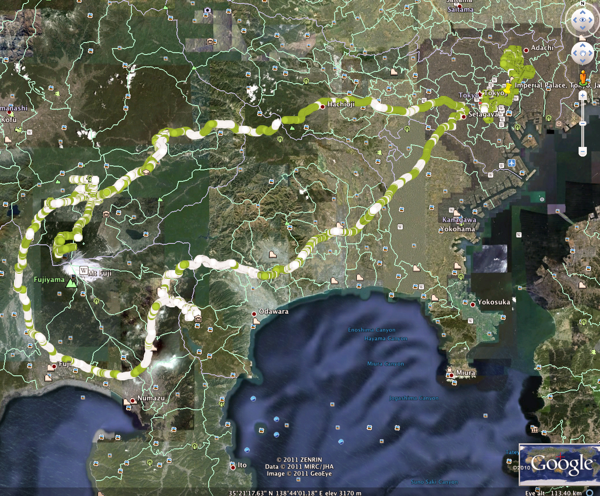 From the start from my home near Shimo-Kitazawa in Setagaya, Tokyo I mounted a Safecast bGeigie equipped with a MedCom Inspector, GPS-equipment and SD-card based recording facility. In other words this model does not require a separate PC, and it is very automated in its operation (except that you must remove the SD-card and move the files over a computer and send them as an attachment to Safecast).