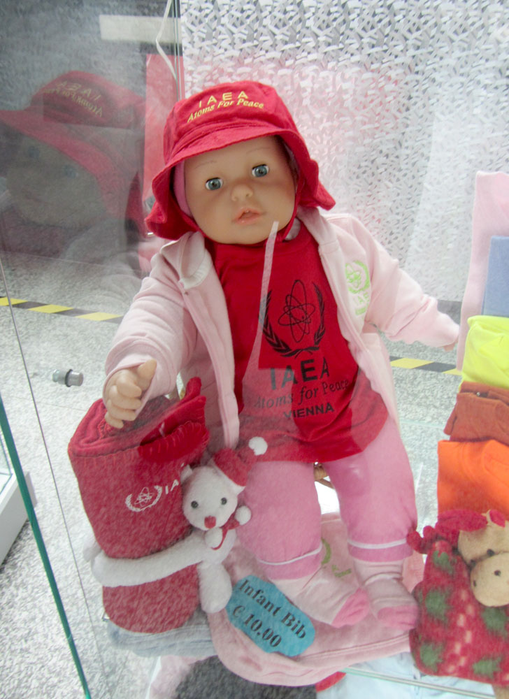 [ギフトショップで見かけた「平和のための原子力」の文字が入った赤ちゃん用のよだれ掛け。意図しないところで皮肉になっています。]