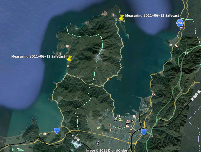More pictures can be found at here.2011 年 6 月 12日、私と林 由佳、DSM TV の撮影班は、会社のビデオ撮影のため敦賀を訪れ、その際に美浜と原電の原子力発電所近辺を Inspector で計測しました。以下がその時の測定値と写真です。