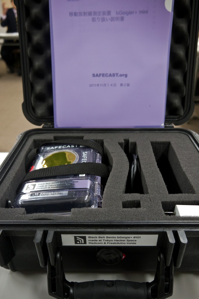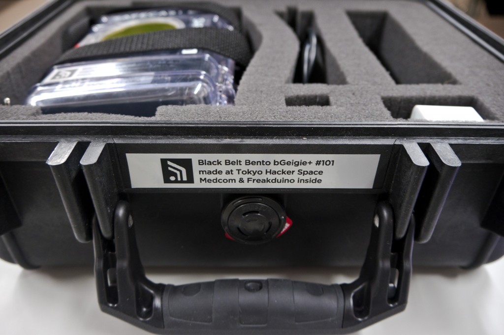 この機会に私たちはbGeigieの特別版、『黒帯弁当bGeigie』を製作しました。黒一色、黒いケースの中に黒いベルトの施されたbGeigieが金色の窓のついた黒いキャリーケースに入れられ納められています。今まで作ったどのbGeigieよりもクールな仕上がりです。これはまたbGeigie新シリーズ(bGeigie+と呼んでいます)の中の第一号で、たくさんの改良が施されています。bGeigie+の頭脳部分にはSafecastのJAMことJoe Morossの頭脳が隠されています。第三世代bGeigieには第二世代のbGeigieミニにいくつかのカギとなる改良、例えば通常のUSB”dongle”としての機能を果たすような改良が加えられています。これまでのbGeigieは電池交換やデータのアップロードのためにSDカードを取り外す際にケースを開けなければなりませんでしたが、bGeigie+では、こうした作業の手間なく、全てがUSBケーブル経由でコンピューターにつながるように工夫してあります。USBケーブルがbGeigie+のリチウムイオン電池を充電するとともに、データファイルの送信を容易にしてくれるのです。Safecastのベテラン、Robin ScheiblerがFreakduinoコードにいくつかの改良を加えてファイル伝達機能を向上させてくれたので、ボランティアの人たちでさえより簡単にファイルのアップロードができるようになりました。bGeigie+の試作品を得たことで、私たちは現在、製品レベルの製作に取り組んでおり、近い将来、もっとたくさんのbGeigie+を路上で使うことができるものと楽しみにしています。